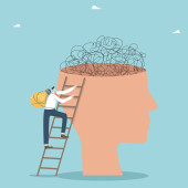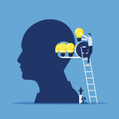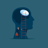 Rozwój osobisty lub poprawa dla sukcesu, postawy wzrostu, motywacja do sukcesu, odwaga, aby znaleźć nową koncepcję możliwości, zaufanie biznesmen wspiąć się po drabinie sukcesu z jego głowy.
