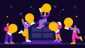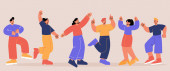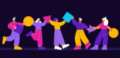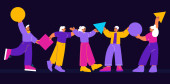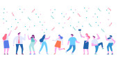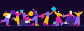 Zdjęcie "Szczęśliwi ludzie na nocnej imprezie z dużymi pudełkami na prezenty, konfetti i balonami. Wektor płaska ilustracja przyjaciół świętować urodziny, wakacje i zabawy razem na czarnym tle" może być wykorzystywane do celów osobistych i komercyjnych zgodnie z warunkami zakupionej licencji Royalty-free. Obraz jest dostępny do pobrania w jakości wysokiej rozdzielczości do 5760x3840.
