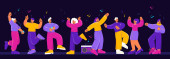 Szczęśliwi ludzie na nocnej imprezie z dużymi pudełkami na prezenty, konfetti i balonami. Wektor płaska ilustracja przyjaciół świętować urodziny, wakacje i zabawy razem na czarnym tle