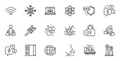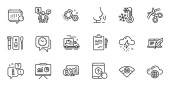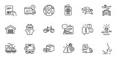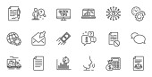 Zarys zestawu Inspect, Szybkie wskazówki i ikony linii uśmiech dla aplikacji internetowych. Rozmowa, informacje, ikona ciężarówki dostawczej. W zestawie miejsce parkingowe, pas bagażowy, całodobowa dostawa ikon. Wektor