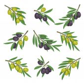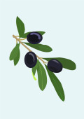 Gałąź oliwna z oliwkami zielonymi i czarnymi, ikona wektorowa lub kliparty. Owoce lub jagody oliwne, element konstrukcyjny izolowany na tle. Przyprawy włoskie lub greckie, żywność ekologiczna, roślina śródziemnomorska.