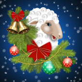 Wesołych Świąt owiec z prezentem na tle noc zimowego krajobrazu