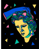 Kolaż z grecką boginią Atrodytą i kształtami geometrycznymi na białym tle.Efekt bitmapy w grafice wektorowej.