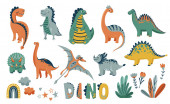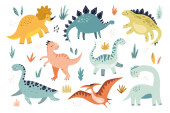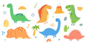 Zestaw uroczych kolorowych dinozaurów. Koncepcja zabawnych zwierząt. Ilustracja wektora w stylu kreskówki
