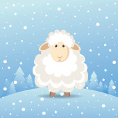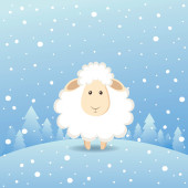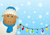 Wesołych Świąt owiec z prezentem na tle zimowego krajobrazu