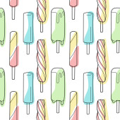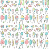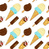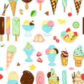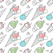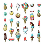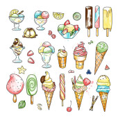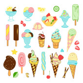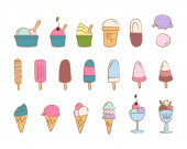 kontur i rysunki kolorystyczne, zestaw lodów w kubku waflowym, w stożku, w misce, na patyku