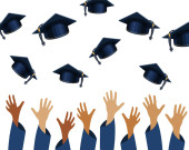 Absolwenci kończący naukę rąk ucznia w sukni rzucający czapki dyplomowe w powietrze