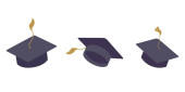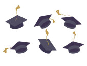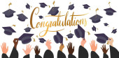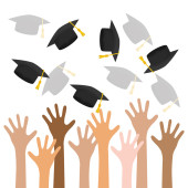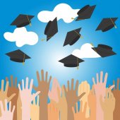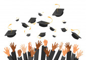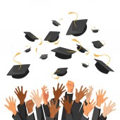 Absolwenci kończący naukę rąk ucznia w sukni rzucający czapki dyplomowe w powietrze