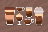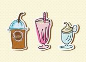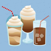 Zestaw orzeźwiających letnich drinków. Kawa mrożona z kreskówek, mrożona latte i zimna herbata z kostkami lodu.