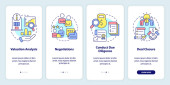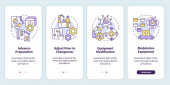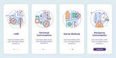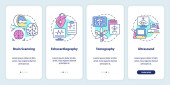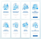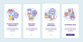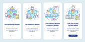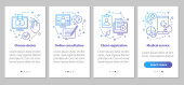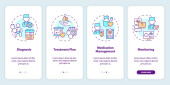 Podejścia do opieki medycznej jasnoniebieski na pokładzie ekranu aplikacji mobilnych. Przejdź przez 4 kroki edytowalne instrukcje graficzne z pojęciami liniowymi. Interfejs, UX, szablon GUI. Myriad Pro-Bold, Czcionki regularne
