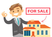 Mężczyzna stoi w pełnym rozkwicie obok plakatu do sprzedaży nieruchomości. Odizolowany. Płaski styl. Element prezentacji, miejsc. Ilustracja wektora