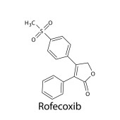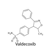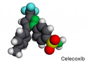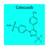 Struktura molekularna celekoksybu, płaska formuła chemiczna szkieletu. NLPZ lek stosowany w leczeniu zapalenia kości i stawów, reumatoidalnego zapalenia stawów, młodzieńczego reumatoidalnego zapalenia stawów. Ilustracja wektora.