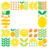 Minimalistyczna płaska rama wektorowa, symbol ikony owoców cytryny. Prosta geometryczna ilustracja cytrusów, pomarańczy, lemoniady i liści. Abstrakcyjny wzór na czarnym tle. Dla przestrzeni kopiowania, social media postów.