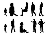 Sylwetki wektorowe, zarys sylwetek osób, rysunek konturu, sylwetka osób, Ikona Odizolowana, Sylwetka siedzących, Zestaw architektoniczny