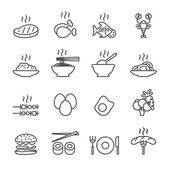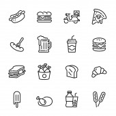 fast food związane wektor cienkich ikon linii. są pizza, hamburger, chleb, rogalik; piwo; miękkie służyć lody, frytki i inne wektor ilustracji izolowane w białym tle