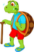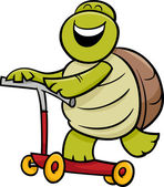 Młody człowiek w kostiumie żółwia chodzi po ilustracji.