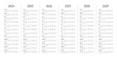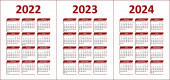 Szablon kalendarza w kolorze białym. Kalendarz na lata 2022, 2023 i 2024. Tydzień zaczyna się w poniedziałek.