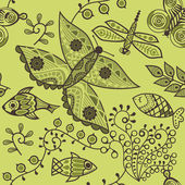 Zielone liście w abstrakcyjnym stylu na zielonym tle. Płynny wzór. Dekoracyjny wzór tkaniny bez szwu. Ilustracja wektora