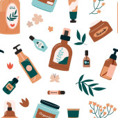 Opakowanie organiczne. Ręcznie rysowane produkty kosmetyczne i pielęgnacja skóry naturalne leczenie, butelki szklane, rurki papierowe i szklane słoiki. Wektorowy płyn do szorowania i zestaw szamponów. Pojemniki ze śmietaną, olejem