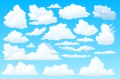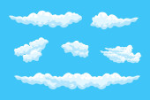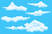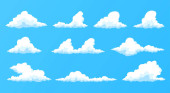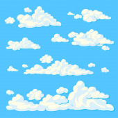 Chmury kreskówki ustawione. Abstrakcyjne białe symbole ikony chmur. Wektor pochmurny krajobraz lub prostota natura panorama lotnicza. Różne okrągłe kształty w płaskim stylu. Zbieranie chmur.