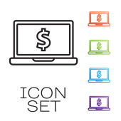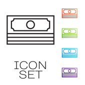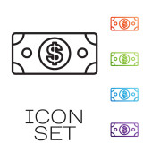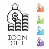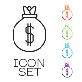 Czarna linia Ikona worka pieniędzy izolowana na białym tle. Symbol dolara lub USD. Znak waluty Cash Banking. Zestaw ikon kolorowe. Wektor.