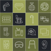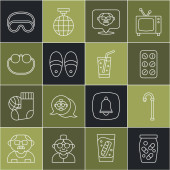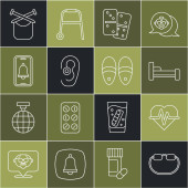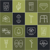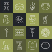 Ustaw linię Eye sleep mask Telefon alarmowy Retro tv Sztuczna szczęka w szkle Pielucha dla dorosłych Laska spacerowa Babcia i ikona Domino. Wektor.
