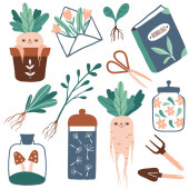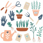 Wektorowe ręcznie rysowane ilustracje ogrodnictwa. Ładne elementy prac ogrodowych: narzędzia, nasiona, doniczka, konewka. Ręce trzymające młode rośliny. Obrazy dla ogrodnika, kwiaciarnia. Wiosna, lato