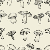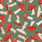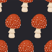 Wektor bezszwowy wzór z trującym niejadalnym grzybem. Ręcznie rysowane Cartoon Red Fly Agaric Mushroom na czarnym. Amanita Muscaria, Mucha Grzyby Agaric.