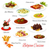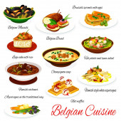 Belgijskie menu. Gulasz z piwa wołowego Carbonnade, sałatka warzywna z tuńczykiem i pieczone endive, sałatka ziemniaczana, duszony kurczak i puree ziemniaczane Stoemp z kiełbasami, Tripe kiełbasy, gulasz śmietankowy Waterzooi