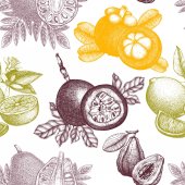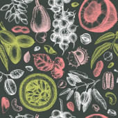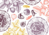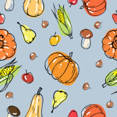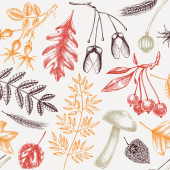 Autumn seamless pattern in sketched style. Botanical drawings of autumn leaves, pumpkins, berries, bird. Vintage fall plants hand drawn background. Thanksgiving day sketches background