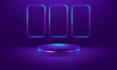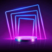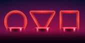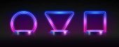 Trzy Cylindry Podium z okrągłą, trójkątną i kwadratową neonową ramą. Vector clip art do projektowania projektu w stylu retro.