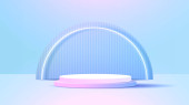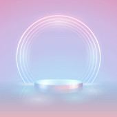 Pusty Cylinder Podium z abstrakcyjnym jasnym trójkątnym neonowym tłem ramki. Vector clip art do projektu sprzedaży w stylu retro.