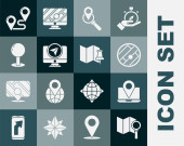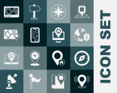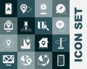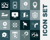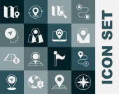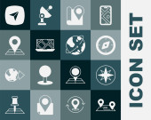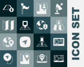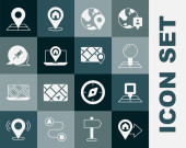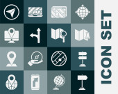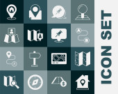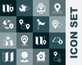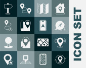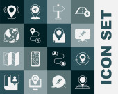 Zestaw Składana mapa z markerem lokalizacji Route Location house Nawigacja po mieście i ikona Push pin. Wektor.