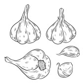 Zestaw ilustracji czosnku w stylu grawerowania. Element projektowy do logo, etykiety, godła, znaku, odznaki. Ilustracja wektora