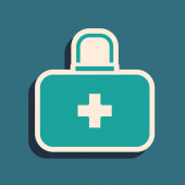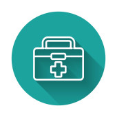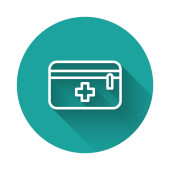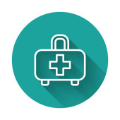 Biała linia Ikona apteczki odizolowana długim tle cienia. Skrzynka medyczna z krzyżem. Sprzęt medyczny na wszelki wypadek. Koncepcja opieki zdrowotnej. Zielony przycisk koła. Wektor.