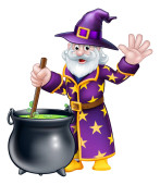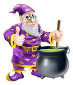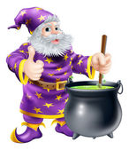 Kreskówka Halloween postać czarodzieja mieszając kocioł i machając magiczną różdżką