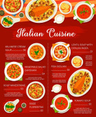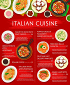 Włoskie menu, kuchnia włoska restauracja dania makaronowe i dania, wektor. Kuchnia włoska i tradycyjne dania kuchni, owoce morza, króliki i lasagne z dyni, tortellini wołowe i makaron rigatoni