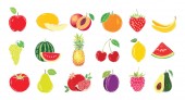 Atutem gry Fruits. Kreskówka egzotycznych owoców organicznych kolekcji, 2D gry sprite jabłka, moreli truskawki śliwki gruszka banan cytryna winogrona. Wektor zestaw owoców egzotycznych i organicznych kolekcji ilustracji