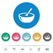 Miska zupy z łyżką płaskie białe ikony na okrągłych tłach kolorów. W zestawie 17 wariantów kolorów tła.