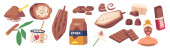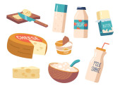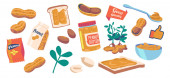 Zestaw Oatmeal Śniadanie, owsianka, płatki owsiane w pudełku, Miska z owocami i jagodami w mleku, słoik Granola. Zdrowa żywność, ziarna, dojrzałe rośliny, łyżka z koncepcją pożywienia. Ilustracja wektora kreskówek .