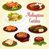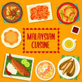 Malezyjskie menu kulinarne, dania kuchni malezyjskiej i azjatyckiej restauracji obiad posiłki plakat, wektor. Tradycyjna zupa z makaronem z mięsa malezyjskiego i krewetek, satay z kurczaka i gulasz z ziemniaków wołowych z mlekiem kokosowym