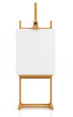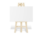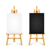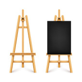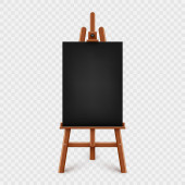 Realistyczne biurko z białym płótnem. Drewniana sztaluga i kartka papieru do rysowania. Deska prezentacyjna na statywie. Sztuka makieta, szablon. Ilustracja wektora.
