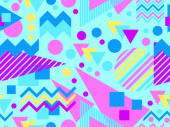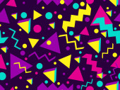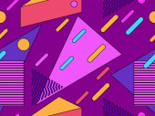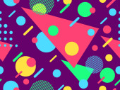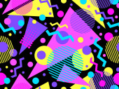 Zdjęcie "Geometryczny bezszwowy wzór z elementami memphis w stylu lat 80-tych. Kolorowy wzór geometryczny. Projektowanie produktów promocyjnych, papieru do pakowania i drukowania. Ilustracja wektora" może być wykorzystywane do celów osobistych i komercyjnych zgodnie z warunkami zakupionej licencji Royalty-free. Obraz jest dostępny do pobrania w jakości wysokiej rozdzielczości do 5760x3840.