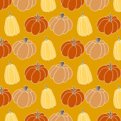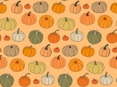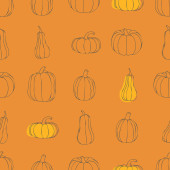Hand drawn cute autumn seamless pattern with various pumpkins. Flat vector Halloween and Thanksgiving print design in doodle style. Repeated background fall harvest wrapping or wallpaper.