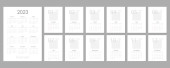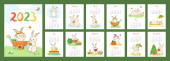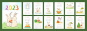 Monthly horizontal wall calendar 2023 tamplate with cartoon cute rabbits. Symbol of the chinese New Year. Sunday start calendar. Set of 12 months with kawaii character animals. Cover A4 A3 A2 A5