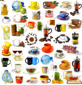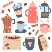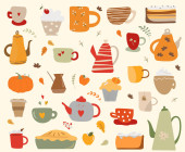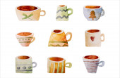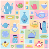 Kubki i czajniki w różnych obrazach wektorowych. Herbata czas kreskówki obrazy zestaw z filiżanek