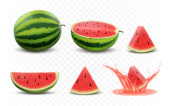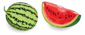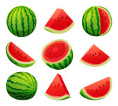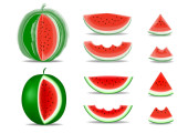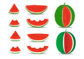 Watermelon vector. Bright vector set of half, whole slice of cut watermelon isolated on white background. Vector illustration.