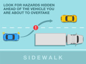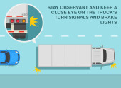 Safe driving tips and traffic regulation rules. Overtaking the semi-trailer on the road. Avoid passing on a truck's right side, this is a worst blind spot. Top view. Flat vector illustration.