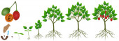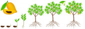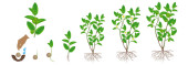 Peanut growth stages, vector groundnut growing process. Timeline from grain, seedling and big plant. Growing life cycle from of penut beans from seed to flowering and fruit-bearing ripe plant