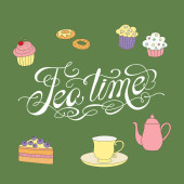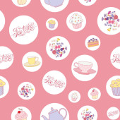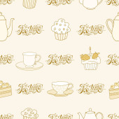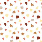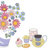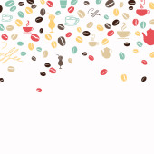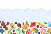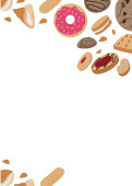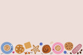 Side border with cups of coffee, buns and cookies. Hand drawn vector illustration.